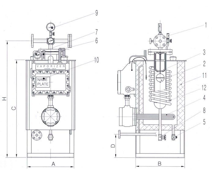Vaporizer บรรจุน้ำอยู่ซึ่งเป็นตัวถ่ายความร้อนชนิดหนึ่ง อุปกรณ์ Vaporizing ประกอบไปด้วย Stainless Steel Pipe Sheath Heaters และ LPG Heat Exchanger Coil